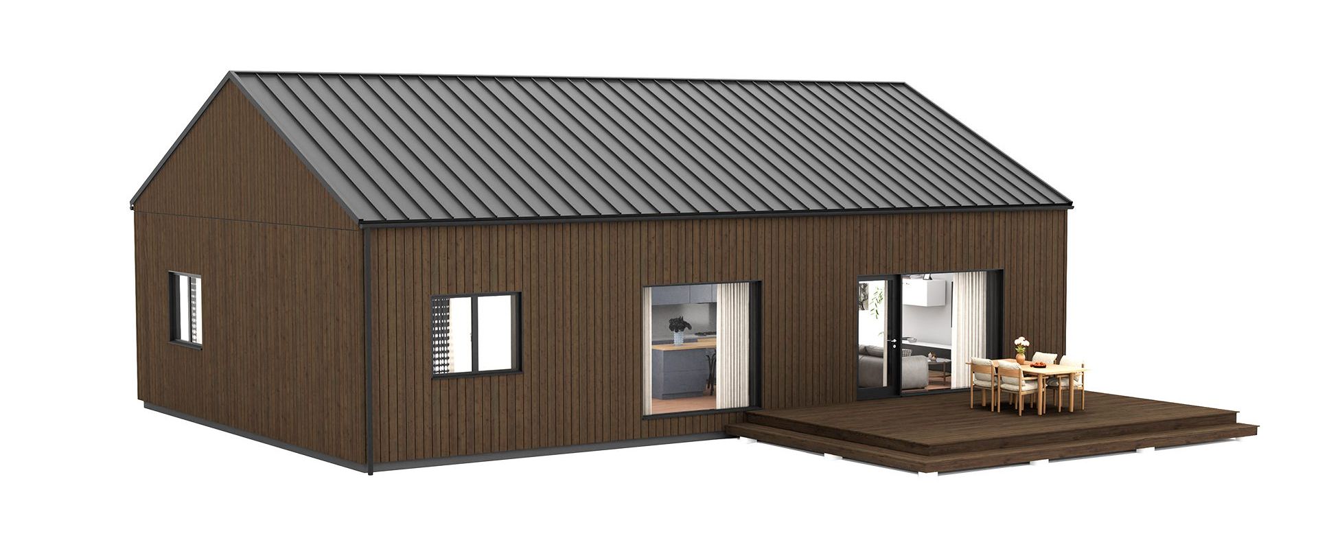 Māja tiek piegādāta kā trīs rūpnieciski sagatavoti moduļi, kuri būvlaukumā tiek savienoti ar augstu precizitāti. Moduļu būvniecības princips ļauj nodrošināt nemainīgu kvalitāti, ātru uzstādīšanu un efektīvu projekta realizāciju neatkarīgi no sezonas.