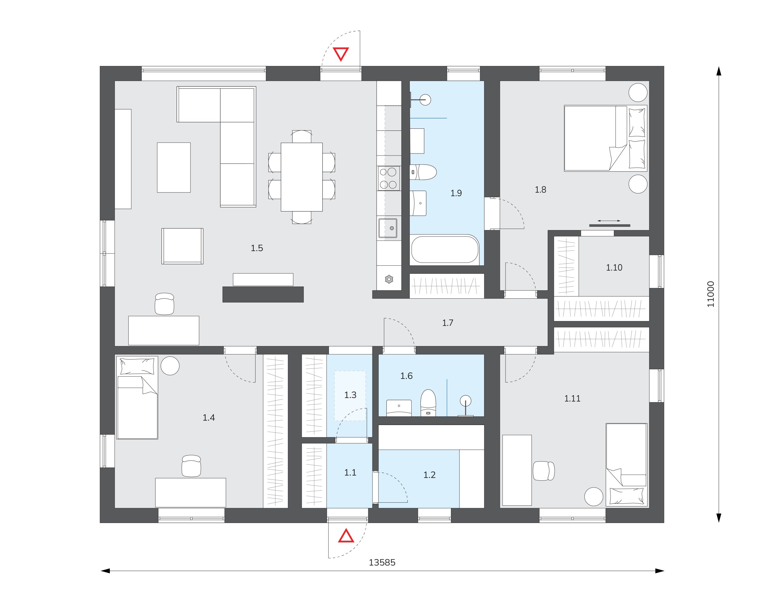 Mājā ir trīs plašas guļamistabas, nodrošinot pietiekami daudz vietas gan ģimenei, gan viesiem. Galvenā guļamistaba aprīkota ar ieejamu garderobi, kas sniedz papildu komfortu un palīdz saglabāt kārtību. Divas pilnvērtīgas vannasistabas, viena ar vannu, otra ar dušu, ļauj pielāgoties dažādām vajadzībām un dienas ritmiem.
