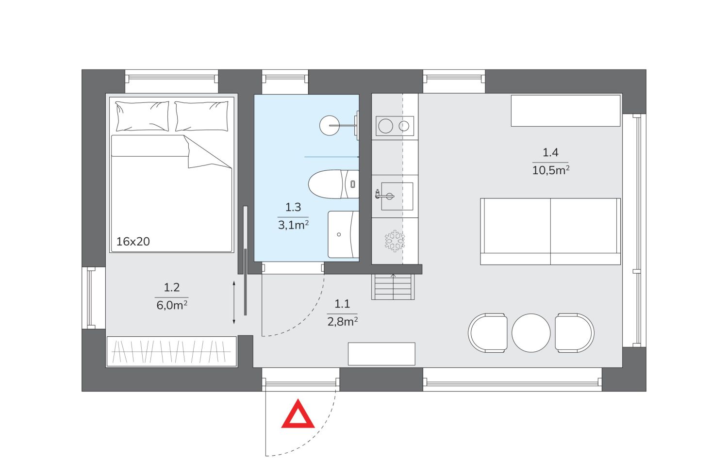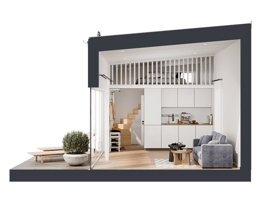 Šī moduļu māja ir pārdomāts risinājums tiem, kas meklē kompaktu, taču funkcionālu mājvietu ar izteiktu telpiskuma sajūtu. Pirmajā stāvā izvietota guļamistaba, vannasistaba un dzīvojamā zona ar virtuvi, kur augstie griesti un lielie logi ļauj telpai elpot un piepildīt to ar dabisko gaismu.